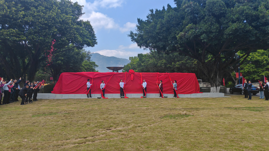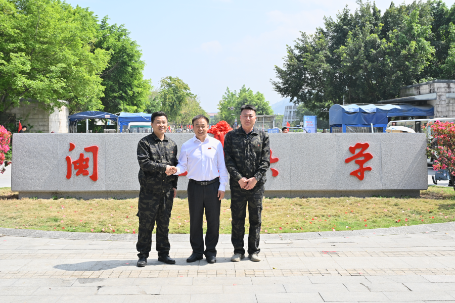 盛典结束后,闽江大学校长舒继武在校园门口“闽江大学”四个字前,与福建老兵特卫集团党支部书记、副总经理张祥成,集团副总经理李博亲切握手合影。